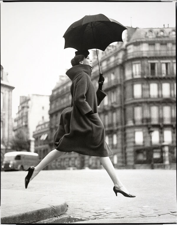 Veniamo alla moda, dove ogni foto racconta una storia a sé. I suoi primi servizi fotografici, sia che siano stati realizzati all’aperto, in esterni, o in interni, hanno tutti una leggerezza, un fascino, che li rende ” glamour”. Avedon ha lavorato con tutte le modelle più famose, da Dovima a Suzy Parker, da Renée a Carmen, da Jean Shrimpton a China Machado, da Veruschka a Linda Evangelista. Meravigliosa è la foto di Suzy Parker che, in abito da sera, apre il mantello che ha sulle spalle ed è come se la modella si presentasse al mondo, come farfalla che esce dal suo bozzolo; oppure, come Renée che, ripresa di schiena, agita la parte finale del suo cappotto, come un pavone quando fa la ruota; e ancora Carmen, che salta da un marciapiede con l’ ombrello aperto e ricorda molto Cartier – Bresson, anche se è un omaggio a Munkarsi; e la magistrale e iconica foto di ” Dovima con gli elefanti”, che considererei la foto ” regina”, perché la modella tra gli elefanti sembra più una regina che una domatrice e perché è la foto simbolo di una donna sicura di sé; e la particolare foto dell’ elegante primo piano di un piede con una scarpa in pelle con pelliccia con lo sfondo sfumato della Tour Eiffel, che dà l’ idea di una donna dominatrice e padrona della situazione, da come posa il piede.