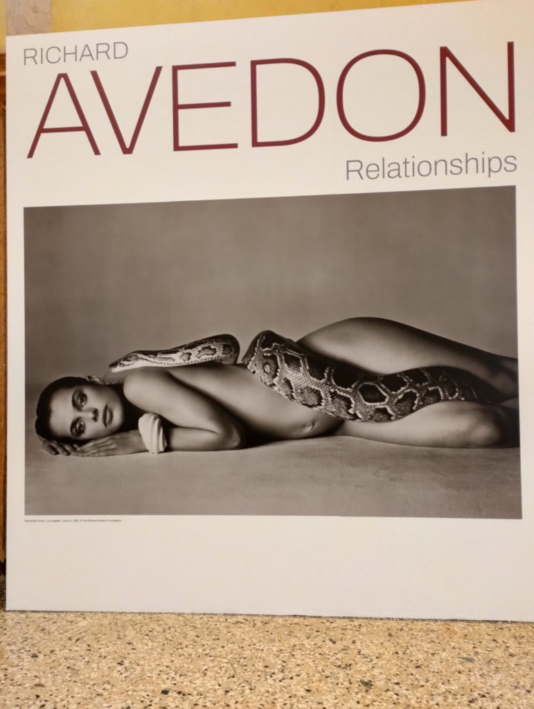 La celebre modella Veruschka, leggiadra e quasi danzante, ritratta in due foto dinamiche e vitali. La foto sensuale e famosissima di Nastassja Kinsky, avvolta dal pitone, che incarna un erotismo pudico, ma seducente; o le tre foto che ritraggono Jean Shrimpton, dove gli abiti o la posa, celano il volto: sono foto ” vedo non vedo”, le uniche dove l’abito ruba la scena alla modella; per terminare con delle foto a colori che immortalano Linda Evangelista, coloratissima e gioiosa; una coppia di modelli nudi che hanno un foulard con disegnate delle farfalle, che copre le loro teste, facendoli sembrare a loro volta, una farfalla e le due foto dei gruppi di modelle e modelli degli anni ’80 e ’90 che li consacrano nell’ Olimpo della Moda. Un fotografo di moda anticonvenzionale, Avedon, che scattava foto nei posti più impensati, facendo in modo che la modella risaltasse su tutto. Nei ritratti, Avedon cerca di penetrare l’intimo delle persone, facendo emergere il loro carattere, la loro vera essenza, come accade nei superbi ritratti dei Beatles, o nella foto dove appare la Dietrich: misteriosa, conturbante, ammaliante, inarrivabile Marlene.