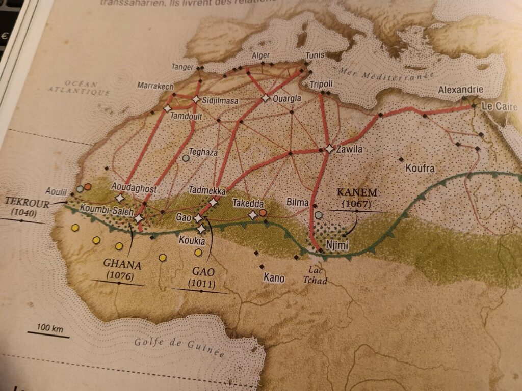 L’altra via è quella occidentale, con l’oro che arriva alla costa occidentale del Marocco e da qui raggiunge Cadice. In concorrenza con i genovesi, le galee fiorentine caricano a Cadice oro, cuoio lavorato, grano. I fiorentini, sulle orme dei genovesi, l’oro lo esportano anche verso il Mare del Nord, nelle Fiandre e in Inghilterra. Nel XIV secolo Giovanni di Carignano, autore del celebre planisfero studiato da La Roncière, parla di Sidilimassa, tappa sulla via del Touat e del Tafilalet come “la porta del Sahara verso la terra dei negri, il paese dell’origine dell’oro, una delle più grandi città del Maghreb e delle più illustri nell’universo”, la città da cui “i mercanti portano mercanzie senza valore e tornano con cammelli carichi di oro grezzo”. Commercio che susciterà la cupidigia di molti, una vera corsa all’oro africano, con viaggi dei genovesi Antonio Usodimare sulla costa del Gambia (1455), Antonio di Noli a Capo Verde (1460), di Antonio Malfante verso l’interno, che raggiunge Touat nel 1447. Nella regione sahelica l’Islam arriva nel X secolo, il viaggiatore arabo Ibn Hawqal visita Sidilimassa e Audaghost nel 952 e vi nota la prima moschea. Anche a Tadmekka i musulmani marcano la loro presenza con delle iscrizioni in lingua araba sulle pareti del massiccio sahariano dell’Adrar d’Ifogas. Ma Hawqal riporta anche della preminenza nella regione del regno del Ghana. Qualche anno dopo è il geografo andaluso al-Bakri che ci lascia una descrizione del Sahel occidentale fra il 950 e il 1068. Il regno del Ghana appare ai visitatori come il regno dell’oro. Del resto, nell’XI secolo la scoperta di un giacimento di salgemma nel Sahara a Teghaza, a metà strada fra la capitale Koumbi e Sidilimassa, aveva aperto un nuovo asse transahariano a favore del Ghana. A metà dell’XI secolo, una dinastia berbera del Nord Africa Occidentale, che sono dei discendenti dei Sanhâgah del ceppo el-Brânes, oltre ad invadere l’Andalusia, scendono verso il Sahara e fondano a Marrakesh la loro capitale nel 1062. Conquistano Audaghost nel 1054, ma non sono loro a convertire all’Islam i regni sahelici. Già dall’XI secolo le dinastie di Tekrur, del Ghana e di Gao sono islamizzate, anche se l’Islam coesiste con le religioni politeiste locali, come conferma proprio Ibn al-Idrisi nel 1154.