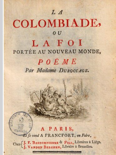 “Christophe Colomb ou l’Amérique découverte » venne pubblicato a Parigi nel 1773 dall’editore Moutard e segue di qualche anno “La Colombiade ou la Foi portée au nouveau Monde “ che Madame Du Boccage aveva pubblicato per l’editore P. Desaint & Saillant nel 1756. Il poema di Bourgeois è in 24 canti – “autant de Chants ou Livres qu’en contient l’Iliade”, secondo l’autore- diviso in due parti, la prima dedicata all’avventura della scoperta, la seconda ai contatti con i nativi dell’isola Hispaniola, entrambe aventi come sfondo l’ammirazione che lo scrittore ha per Colombo “J’y conduis mon Héros comme par la main, depuis le premier Chant jusqu’au dernier; il est toujours présent; c’est lui qui agit, ou pour qui l’on agit…..”. Bourgeois si era informato sulla spedizione di Colombo nell’isola leggendo “L’Histoire de l’Isle espagnole ou de Saint-Domingue” del padre gesuita Pierre-François-Xavier de Charlevoix che aveva ripreso sia l’interessantissimo Diario di bordo che le “ Historie della vita e dei fatti di Cristoforo Colombo di D. Fernando Colombo suo figlio”. Se il modo di esistere spagnolo, la “morada vidal” di cui parla Americo Castro, è quella nel XV secolo di esistere come credente, se la conquista spagnola del mondo è fatta non con regola e compasso ma per la missione di allargare i confini della fede, allora la descrizione che Bourgeois fa di Colombo sembra attecchire perfettamente allo spirito del tempo.