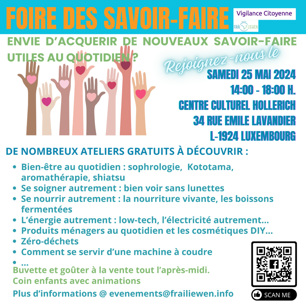 Samedi 25 mai, au Centre Culturel de Hollerich, Vigilance citoyenne asbl organise la première Foire des Savoir-Faire au Luxembourg. Concept novateur, cette foire se veut un espace vivant, interactif et collaboratif avec des ateliers pratiques entièrement gratuits concernant le bien-être, l’alimentation saine, la maison et la technologie écologique.