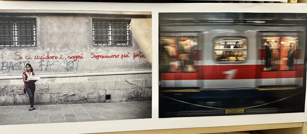 La gente è tanta, più di quanto si potesse prevedere, e con la “scusa” di guardare le foto molte ben allestite da Beatrice Saraceno e le sue collaboratrici, ci si sofferma a parlare di città, di colori, di bianco e nero della pandemia, di fiori, di luci, di volti stanchi e di sguardi tristi ma anche di donne bellissime e di bambini allegri.