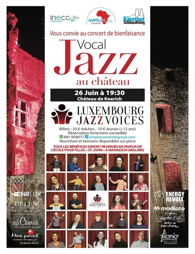 Per molti anni, ogni estate un gruppo di soci si recava in Eritrea per dare un contributo per la produzione. Finalmente lo scorso anno, dopo l’interruzione causa pandemia, siamo riusciti a tornare in Malawi dove da alcuni anni stiamorealizzando diversi progetti. Tutti i progetti sono realizzati esclusivamente con partner locali, che conosciamo e con cui collaboriamo da anni e questo ci dà la garanzia della loro corretta realizzazione, sia nelle modalità sia per le tempistiche. Con il trasferimento in Lussemburgo abbiamo trovato un altro gruppo di amici che condividevano i nostri ideali e obbiettivi e abbiamo fondato Ampelos Luxembourg asbl nel 2021. I soci di Ampelos Luxembourg si dedicano principalmente alla divulgazione dei progetti, alla creazione di eventi come questo concerto per far conoscere la nostra associazione e alla raccolta dei fondi necessari per la realizzazione dei diversi progetti. Ci piace sottolineare che il 100% dei fondi raccolti sono destinati alla realizzazione dei progetti, essendo la nostra associazione fondata esclusivamente sul volontariato dei soci, e le poche spese di gestione della stessa sono coperte dalle quote di iscrizione dei soci stessi.