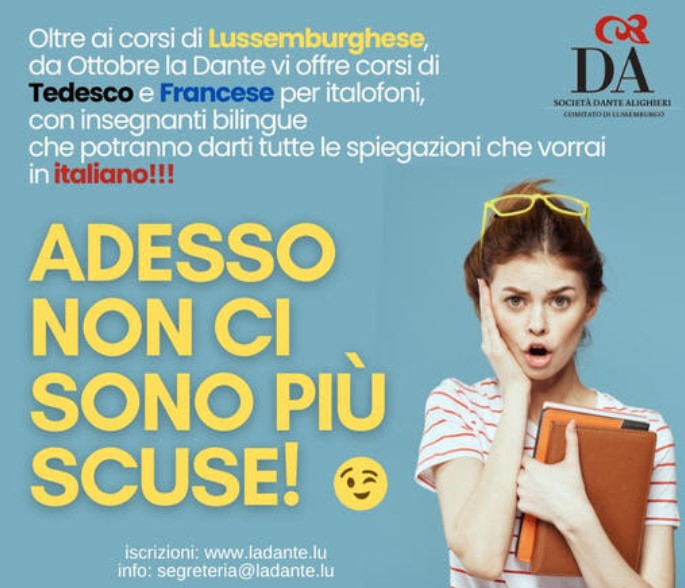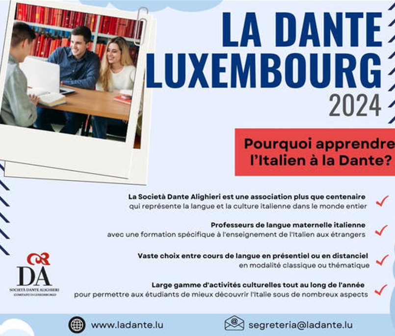 La Dante Lussemburgo organizza corsi di lingua italiana per stranieri con particolare attenzione alle abilità comunicative, condotti da insegnanti di madrelingua qualificati nell’insegnamento della lingua italiana come L2. Il numero degli iscritti per classe è tenuto deliberatamente basso per consentire a tutti i partecipanti di trarre vantaggio il più possibile dall’atmosfera accogliente di un piccolo gruppo e dalle sue dinamiche comunicative.