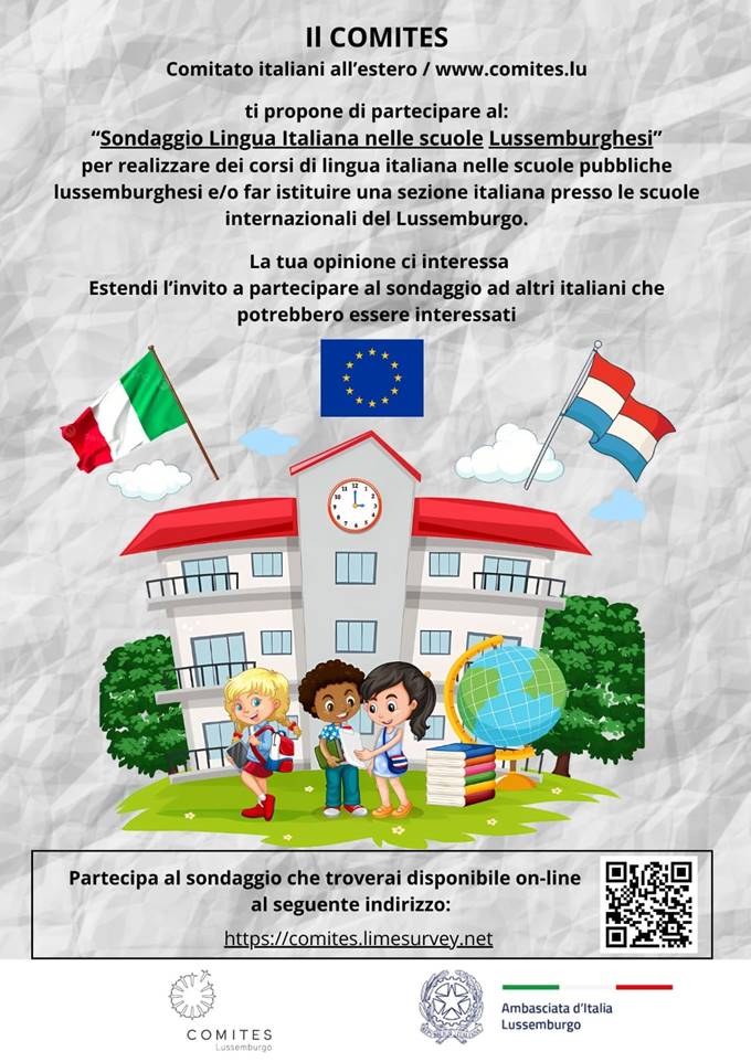 La commissione IACLI (Istituzioni, Associazionismo, Cultura e Lingua italiana) del Com.It.Es Lussemburgo – il cui fine è adoperarsi per migliorare l’integrazione degli italiani all’estero – vi propone di partecipare al «Sondaggio Lingua italiana nelle scuole lussemburghesi» per realizzare dei corsi di lingua italiana nelle scuole pubbliche lussemburghesi e/o istituire una sezione italiana presso le scuole internazionali del Granducato