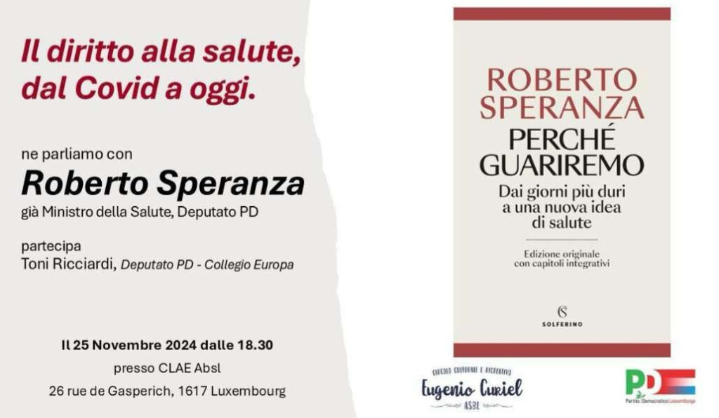 Lunedì 25 novembre (ore 18:30) presso il CLAE, appuntamento con Roberto Speranza, ex Ministro della Salute italiano che incontrerà il pubblico in occasione della presentazione del suo libro “Perché guariremo. Dai giorni più duri a una nuova idea di salute” (Solferino, 2024). Partecipa anche l’on. Toni Ricciardi, deputato PD, Collegio Europa. Evento organizzato dal Circolo PD Lussemburgo e dal Circolo Culturale e Ricreativo “Eugenio Curiel”.