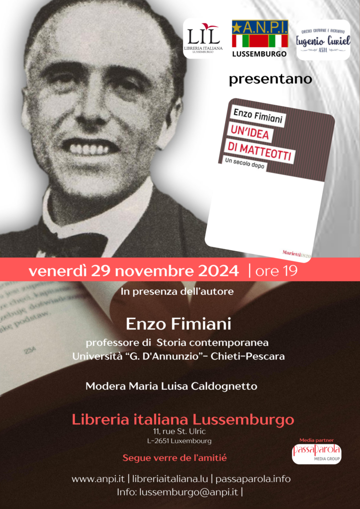 Un libro che si attendeva (Ridolfi). Un libro diverso (Rapone). Così è stato definito il volume “Un’ idea di Matteotti. Un secolo dopo” (edito Marietti1820, 2024) che Enzo Fimiani, professore di Storia contemporanea all’Università “G. D’Annunzio” di Chieti-Pescara, è stato invitato a presentare il prossimo venerdì 29 novembre (ore 19) alla Libreria italiana di Lussemburgo dalla sezione ANPI-Lussemburgo e dal Circolo “E.Curiel” in occasione dei 100 anni dalla morte. Modera Maria Luisa Caldognetto. Ne abbiamo parlato con l’autore