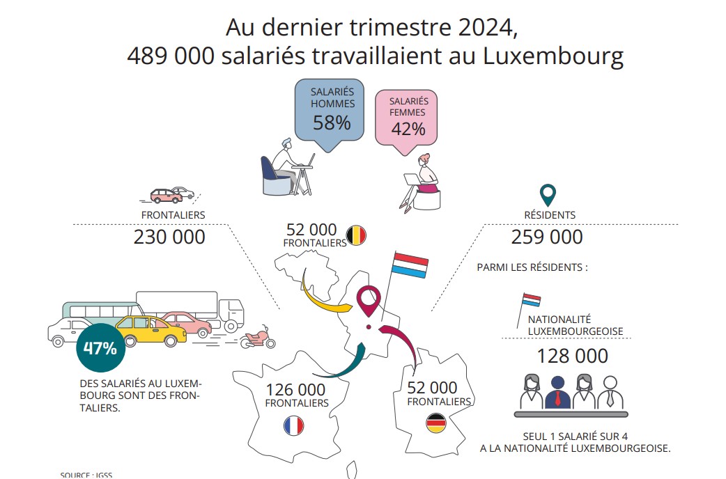 Nel 2024, il Granducato aveva 489.000 dipendenti, di cui quasi la metà (47%) erano lavoratori transfrontalieri, soprattutto francesi (126.000). Solo 1 dipendente su 4 era di nazionalità lussemburghese. Il Lussemburgo si distingue anche per i suoi salari elevati, al secondo posto nell’Unione europea con un salario orario mediano di 24 euro. Il divario retributivo tra i sessi è invertito: le donne sono pagate in media più degli uomini, il che rende il Lussemburgo un’eccezione in Europa. Il tasso di occupazione complessivo è leggermente diminuito nel 2024, ma l’occupazione femminile continua ad aumentare. Si distingue anche la frequenza del lavoro domenicale, con un’ampia percentuale di dipendenti – quasi uno su quattro – che lavora la domenica, regolarmente o occasionalmente. La salute sembra essere un fattore chiave per l’occupazione, con una grande maggioranza di residenti (80%) che si sente in buona salute, un fattore che influenza direttamente la loro partecipazione al mercato del lavoro. Infine, dalla fine del 2024, la crescita dell’occupazione è rallentata bruscamente all’1%, e ad appena lo 0,5% escludendo il settore pubblico.