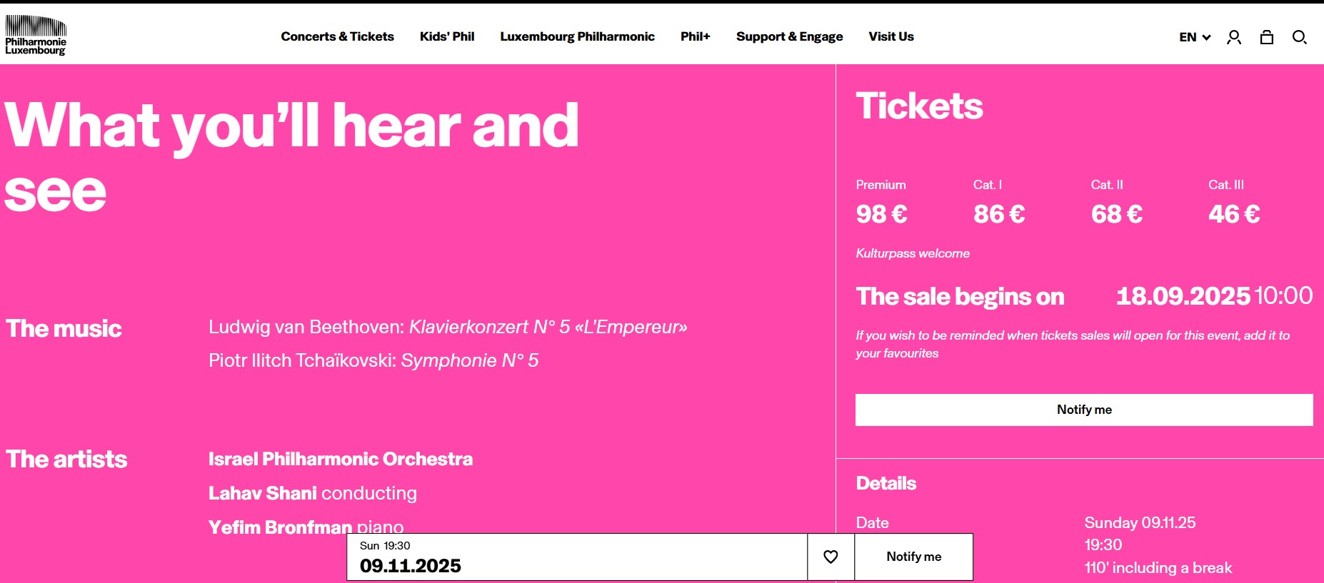 Leggo che il 9 Novembre 2025 la Filarmonica di Lussemburgo ospiterà l’orchestra Filarmonica d’Israele(https://www.philharmonie.lu/en/programme/2025-26/beethoven-tchaikovsky-000000e9001ab953). Dopo quasi due anni di genocidio, in cui ho visto soldati israeliani sparare a persone in fila per un sacco di farina, incendiare tende con dentro famiglie, gareggiare nel colpire con piu precisione agli arti i bambini e compiere simili atrocità senza alcun rimorso, la scelta della Philharmonie mi sembra insensibile e inopportuna.