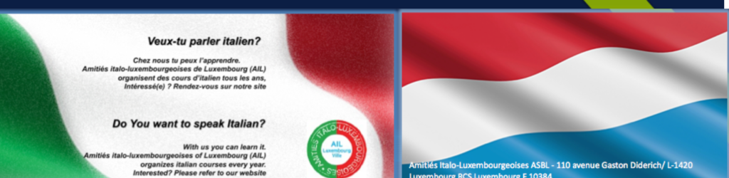 Les Amitiés Italo-Luxembourgeoises ASBL ont le plaisir de vous informer que nos cours de langue et culture italiennes reprendront les 6 et 7 octobre 2025. Ils se tiendront en présentiel, dans les locaux de l’Athénée de Luxembourg, 24 boulevard Pierre Dupong à Luxembourg, le lundi ou le mardi de 18h30 à 20h00. Ils s’étendront sur 26 semaines, avec interruption pendant les vacances scolaires luxembourgeoises. En cas de nécessité, ils sont susceptibles d’être donnés online