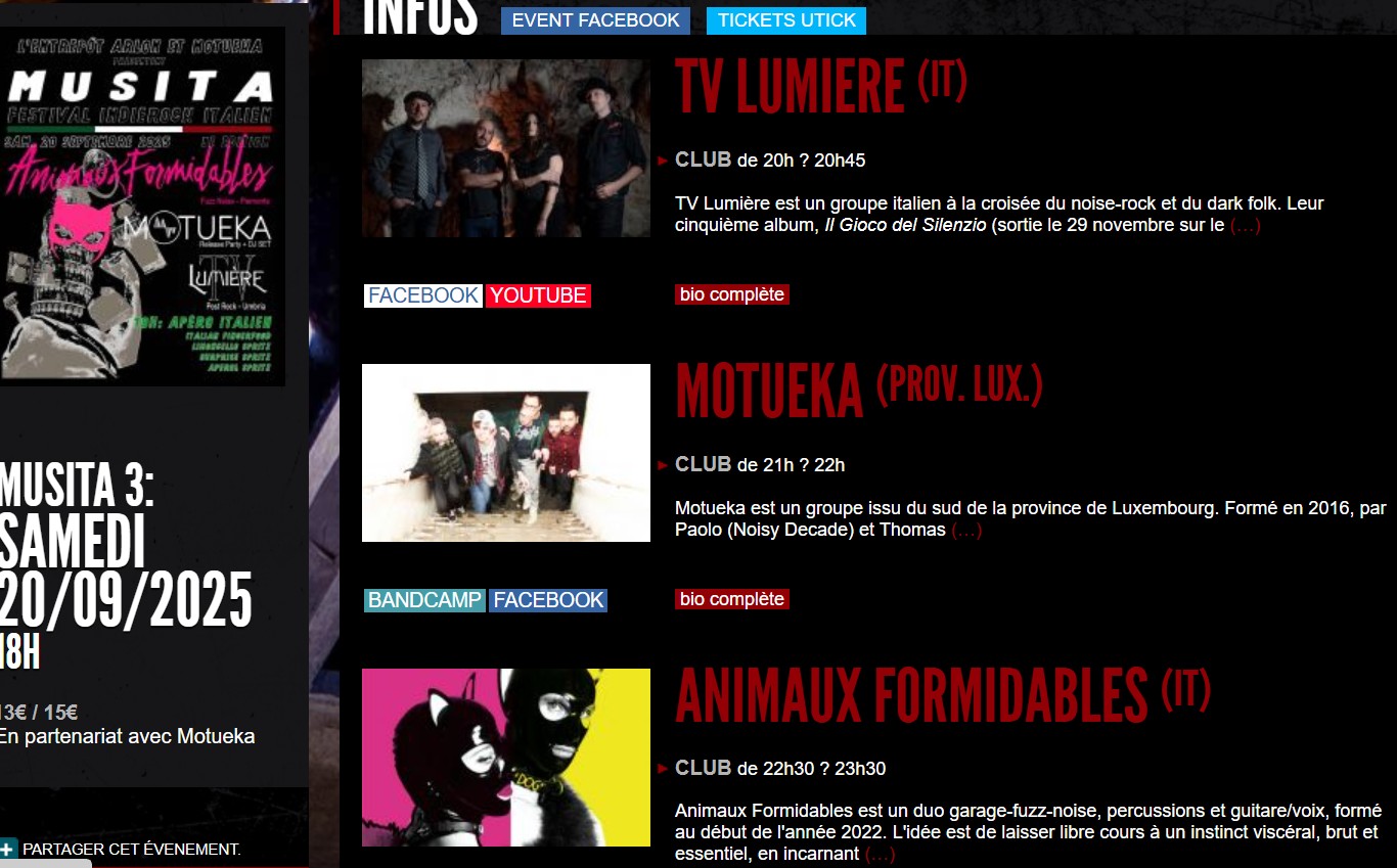Sabato 20 settembre all’Entrepot d’Arlon (Belgio) in scena il festival di musica indipendente MUSITA 3 con le band dei ANIMAUX FORMIDABLES, MOTUEKA e TV LUMIERE. Ce ne parla il direttore artistico Paolo Orlandi. Aperitivo italiano previsto dalle ore 18. Un appuntamento da non mancare!!