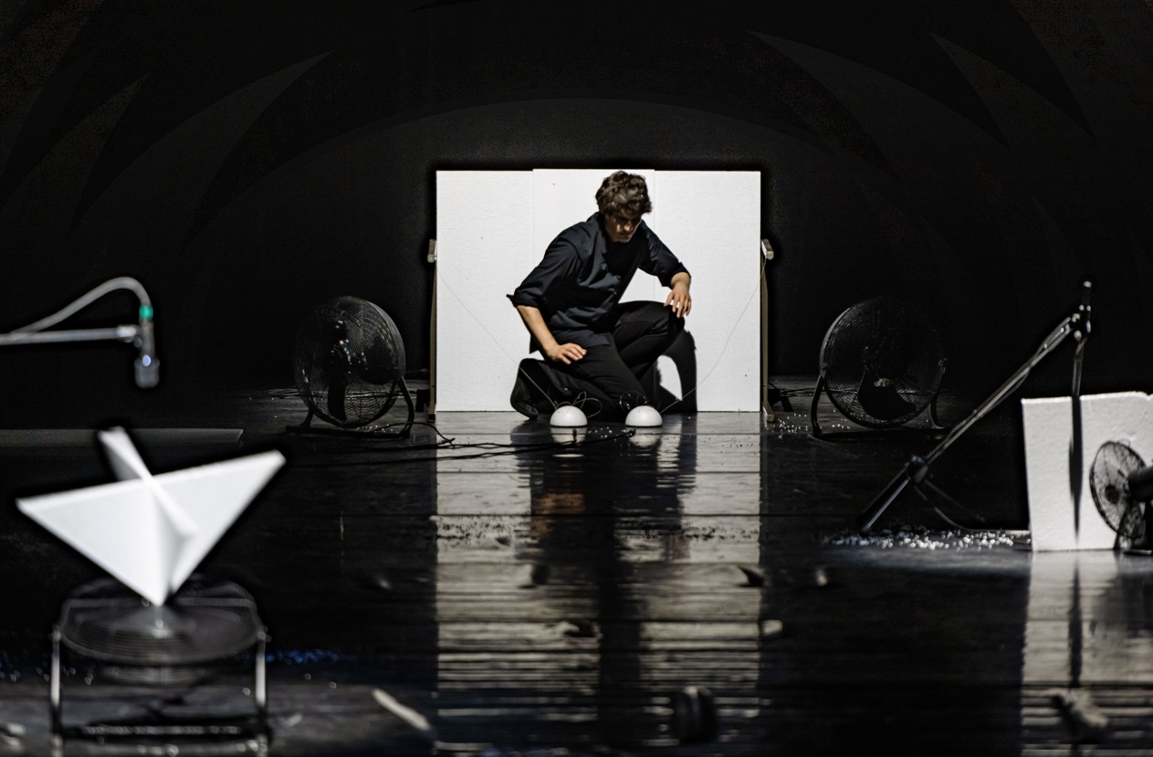Il mio modo di fare coreografia è fortemente orientato verso la ricerca e la sperimentazione, e lo considero una prosecuzione del mio percorso filosofico: semplicemente è più pratico, non solo teorico. MATERIA trae ispirazione da teorie de-antropocentriche in particolare da un ramo del realismo speculativo noto come Object-Oriented Ontology. Questa filosofia ci invita a guardare la realtà senza privilegiare la prospettiva umana, proponendo invece un’ontologia piatta in cui tutti gli oggetti – reali, fittizi, naturali, artificiali, umani o non umani — sono reciprocamente autonomi e possono entrare in relazione tra loro solo in modo indiretto. Nel mio spettacolo, ho provato a sviluppare queste teorie creando una serie di apparati in cui gli oggetti possono prendere iniziative che vanno oltre il mio controllo, diventando soggetti dell’azione scenica. L’interazione con il performer diventa così un dialogo in cui, a volte, la voce del materiale risulta più forte della mia, che invece resta in ascolto insieme al pubblico.