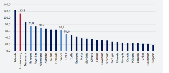 Se si analizza l’andamento della produttività nominale che, ricordiamo, corrisponde al valore aggiunto creato per ora lavorativa, risulta che l’andamento lussemburghese non è affatto fuori dalla norma. Tra il 2010 e il 2024 la produttività nominale è cresciuta in Lussemburgo nella stessa misura del Belgio e dell’Unione europea e in misura notevolmente maggiore rispetto alla Francia. Sarebbe quindi errato affermare che il vantaggio competitivo del Lussemburgo si sia ridotto nel corso degli anni. Nel suo parere sul progetto di bilancio dello Stato, la Banca centrale del Lussemburgo osserva che «la traduzione dei risultati del settore delle attività finanziarie e assicurative nella contabilità nazionale è sempre stata un’operazione difficile, in particolare per quanto riguarda il margine di intermediazione delle banche e del settore finanziario. Infatti alcune operazioni del “margine di interesse” non sono incluse nella produzione e di conseguenza nel Valore Aggiunto Lordo (VAL) del settore; e quindi non hanno alcun impatto sul PIL in valore e sul PIL in volume. Ora è proprio il conto del “margine di interesse” che è aumentato a livelli storicamente elevati negli ultimi anni, sotto l’effetto dell’aumento dei tassi di interesse. Anche la classificazione del Lussemburgo come “Paese da situare nella media sufficiente” deve quindi essere relativizzata.