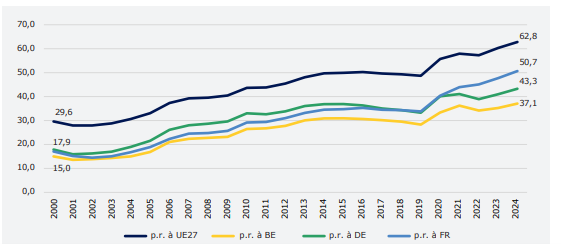 Un’analisi del divario assoluto nella produttività nominale del Lussemburgo rispetto ad altre economie mostra che il vantaggio comparativo del Lussemburgo continua a crescere. Mentre nel 2000 un’ora di lavoro in Lussemburgo produceva circa 30 euro in più di valore aggiunto rispetto alla media europea, questo vantaggio è gradualmente aumentato fino a raggiungere quasi 63 euro nel 2024. Lo stesso fenomeno si osserva anche nei Paesi confinanti: all’inizio degli anni 2000 il valore aggiunto creato per ora lavorata era superiore a quello osservato in Francia e Belgio. Il vantaggio del Lussemburgo in termini di produttività rispetto alle altre economie è quindi più che raddoppiato negli ultimi due decenni e ha raggiunto livelli senza precedenti. Questo risultato storico dovrebbe contribuire a relativizzare, se non addirittura a confutare, i discorsi allarmistici su una presunta erosione della competitività e dell’attrattiva del Paese.