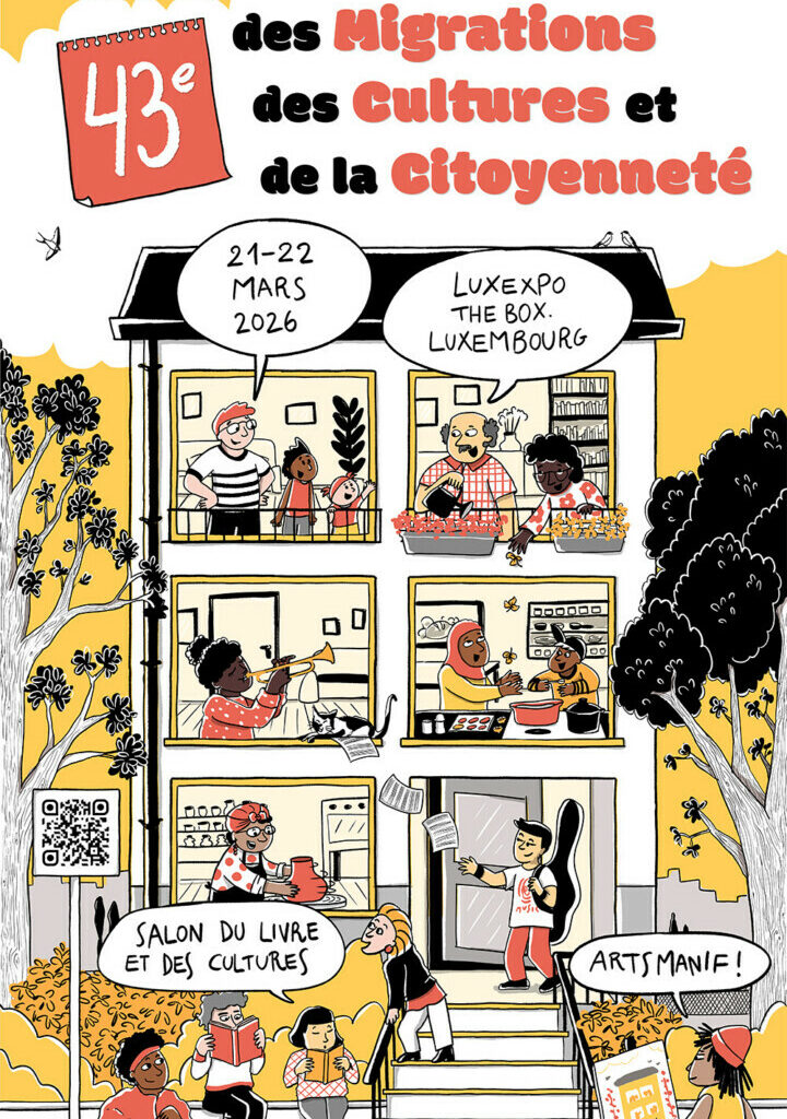Basée à Buenos Aires, Angie Cornejo est illustratrice et réalisatrice d’animation. Directrice créative de la série pour enfants Plim Plim, un héros du cœur, elle a collaboré à plusieurs productions audiovisuelles et projets de bande dessinée. Elle s’implique depuis 2020 dans des projets de création au Luxembourg, notamment l’illustration de Elles nous racontent, scénarisé par Sol Cifuentes et publié conjointement par neimënster et le ministère de la Famille, des Solidarités, du Vivre ensemble et de l’Accueil. Espace d’échanges et de dialogue autour des dynamiques associatives, de rencontres, musiques, films, gastronomies, littératures, arts et débats, le Festival des Migrations, des Cultures et de la Citoyenneté, accompagné du Salon du livre et des Cultures, d’Artsmanif et du Village – tiers-lieu citoyen éphémère, témoigne depuis plus de quarante ans du métissage culturel qui façonne le Luxembourg.