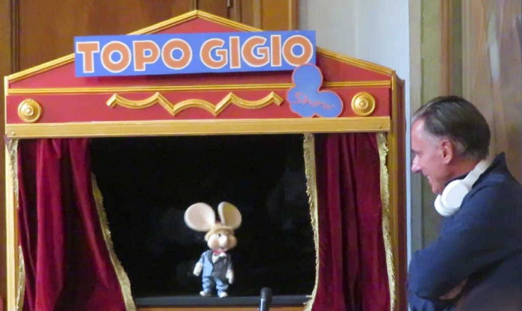 La “chicca” dell’evento di presentazione giunge sul finale, quando Topo Gigio compare dal vivo nel teatrino allestito in sala. “Io so di essere vivo nell’amore che do”, sottolinea ancora una volta con la voce di Leo Valli. Poi, risponde alle domande dei giornalisti. Gli domandiamo cosa pensi di quei personaggi horror, perfidi e malvagi, che imperversano nelle fiction ai danni dei più piccini, alimentando in loro sentimenti di violenza e convincendoli che a vincere siano sempre i cattivi. Gigio saltella, agita le grandi orecchie e con la sua vocina dolce dice: “Preferisco avvalermi della facoltà di non rispondere”.