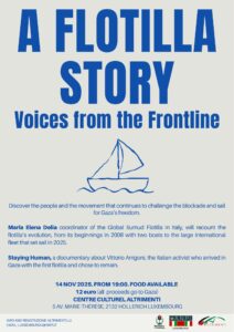 An evening of testimonies, film and dialogue on the sea movements of solidarity with Gaza. With Maria Elena Delia, coordinator of the Global Sumud Flotilla in Italy, and screening of Staying Human, the Al Jazeera documentary on Vittorio Arrigoni.