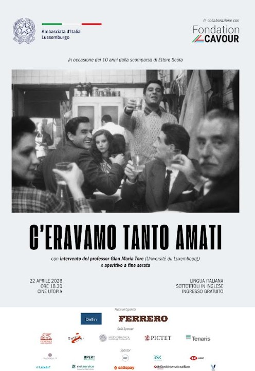 In occasione del decimo anniversario della scomparsa del regista Ettore Scola, figura centrale del cinema italiano del Novecento, l’Ambasciata d’Italia in Lussemburgo, in collaborazione con la Fondazione Cavour, è lieta di invitarvi alla proiezione del celebre film “C’eravamo tanto amati” (1974).