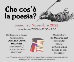 L’Università di Trier, insieme al Centro Studi sull’Italia di Stoccarda, hanno l’onore di invitarvi ad una conferenza in lingua italiana sulla poesia e sulla didattica della poesia tenuta dalla Dott.ssa Laura Mautone. L’incontro si terrà il prossimo Lunedì 28 novembre dalle ore 12.30 alle ore 14.00 via piattaforma ZOOM. La partecipazione è gratuita, vi aspettiamo !
