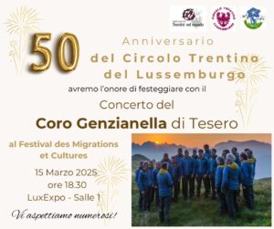 Circolo trentino del Lussemburgo festeggia il Cinquantesimo anniversario della fondazione del Circolo con un concerto imperdibile del Coro Genzianella di Tesero, uno dei più noti cori trentini con repertorio di canti della montagna. L’evento avverrà nell’ambito del Festival delle Migrazioni e delle Culture, Salle 1.