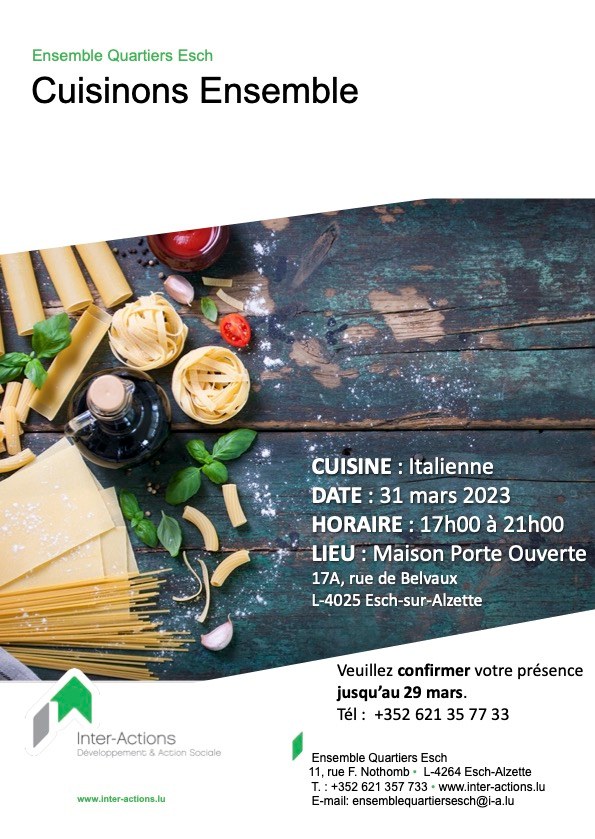 Le service Ensemble Quartiers Esch a Le plaisir de vous inviter à la prochaine édition du “Cuisinons Ensemble” sous Le thème de la cuisine italienne En date du vendredi Le 31/03/2023 à la Maison Porte Ouverte (17A, rue de Belvaux L-4025 esch-sur-alzette).