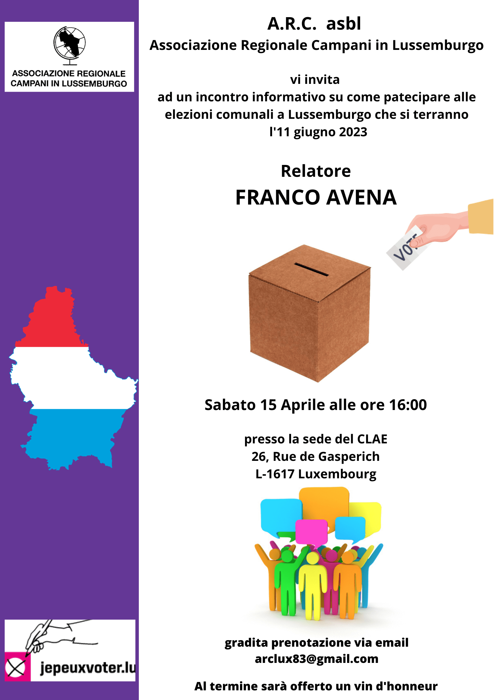 L’ A.R.C. asbl – Associazione Regionale Campani organizza un incontro informativo sulle prossime elezioni comunali in Lussemburgo che avranno luogo l’11 giugno p.v. .