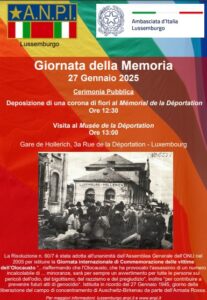 Lunedì 27 Gennaio – 12:30 / Deposizione di fiori presso il Memoriale delle deportazioni dal Lussemburgo con l’Ambasciata d’Italia e, a seguire, visita al Museo della deportazione / Rue de la Déportation, L-1415 Luxembourg, Gare de Hollerich, Luxembourg.