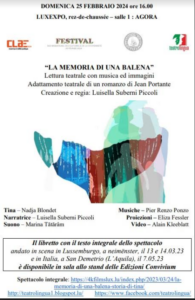 Convivium sarà presente al Festival des Migrations 2024 a Luxexpo, domenica 25 febbraio, ore 16 (salle 1 AGORA), con una riproposizione in forma ridotta dello spettacolo di Teatrolingua « La memoria di una balena. Storia di Tina », ispirato al celebre romanzo di J. Portante e andato in scena nella sua versione integrale, con la regia di Luisella Piccoli, nella primavera scorsa, sia all’Abbaye de Neumünster sia a San Demetrio ne’ Vestini (L’Aquila), riscuotendo un notevole successo.